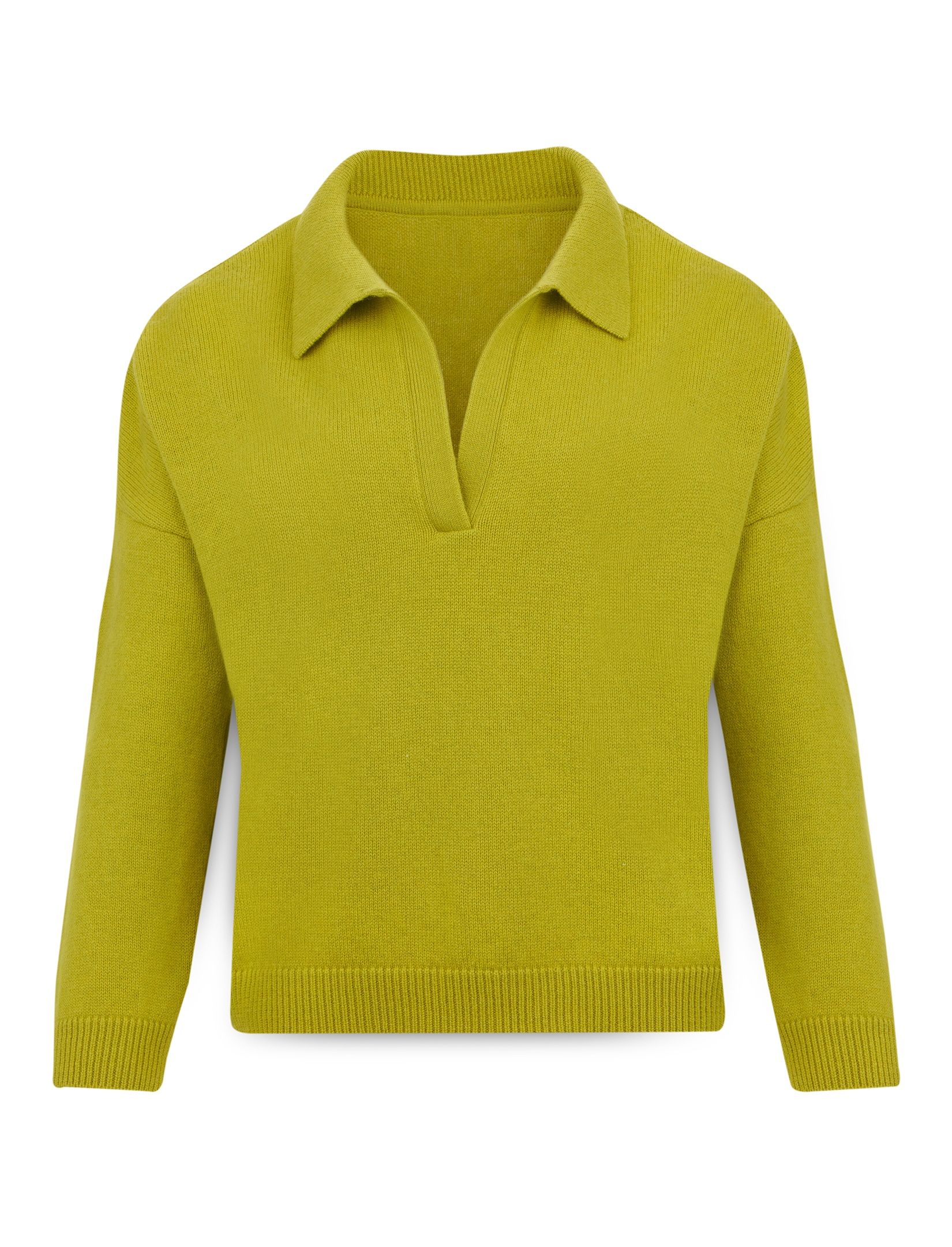 Elegant boxy sweater made of 100% soft lambswool from the Italian spinning mill Filatura di Pollone. Deep slit neckline finished with a collar. Oversized model with dropped shoulders. Product made using fully fashioned technique with attention to every detail. Quality of workmanship at the highest level.